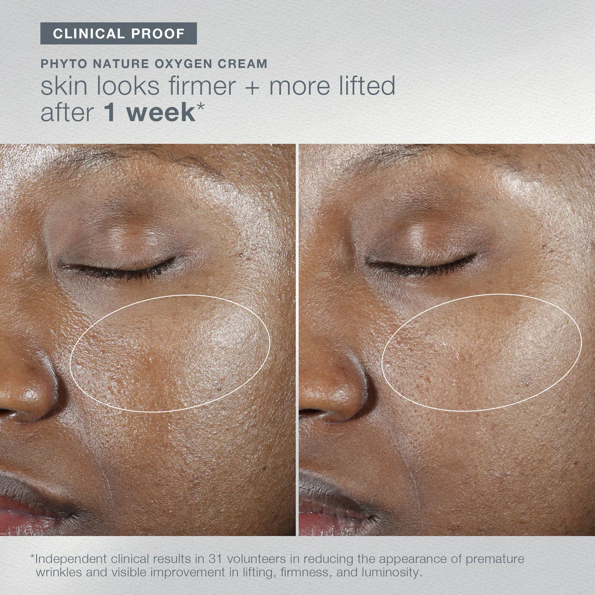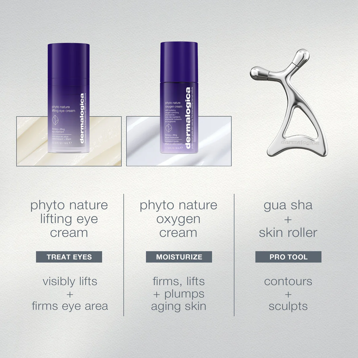 After cleansing and toning, apply Phyto Nature Oxygen Cream over face and neck in light, upward strokes. Use twice daily, morning and night. Shake bottle before each use. Keep out of eyes. Warm a pea-sized amount of Phyto Nature Lifting Eye Cream between fingers. Gently pat onto undereyes and eyelids, massaging in an upward motion from the orbital bone toward temples. Use twice daily. Enhance your routine with the Gua Sha skin roller. Use the smooth curved end of Gua Sha to glide from center of chin to back of jaw, 3x/side. Then, glide from sides of nose along cheekbones. Finally, use the inner curved side to glide upward from brow to hairline, 3x/side. Glide skin roller 3x/side: from center of chin to back of jaw, from sides of nose along cheekbone, over brow from center to end.